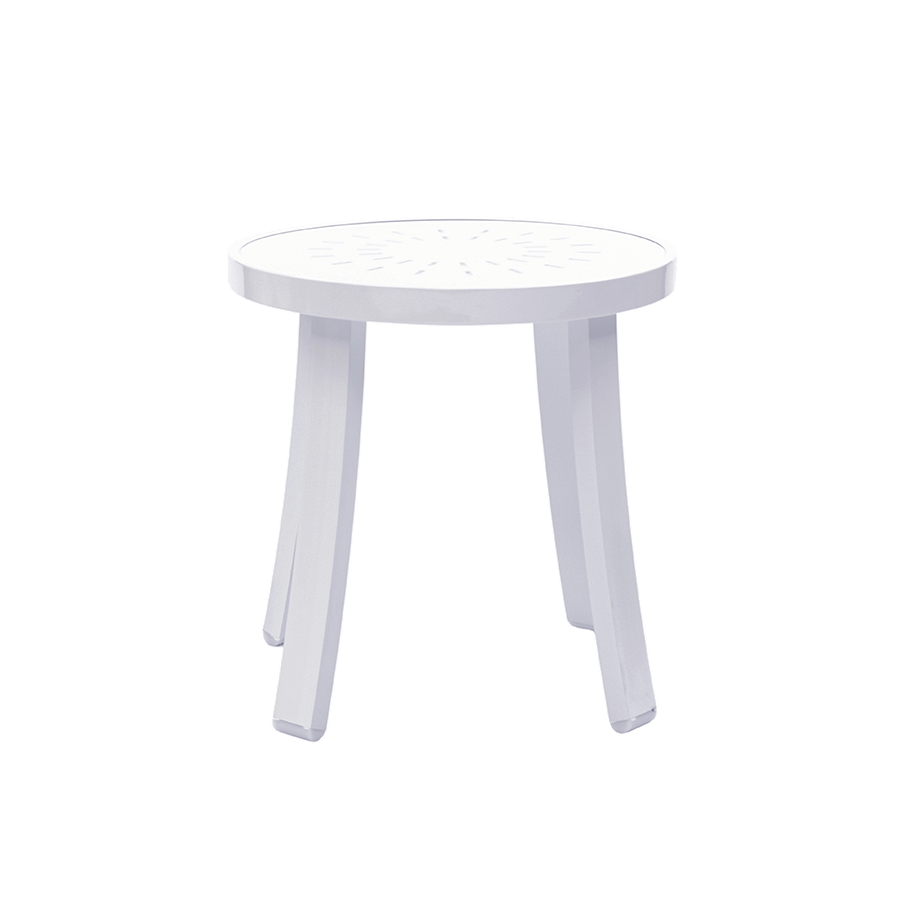 The 18" Round Dockside Punched Aluminum Cocktail Side Table is the perfect addition to any outdoor setting, providing a handy spot for guests to set their drinks and personal items while they unwind outside. Combining durability with style, this cocktail table enhances the elegance and functionality of spaces like hotels, resorts, clubhouses, or poolside areas. It features a CNC-crafted punched aluminum top that not only offers a sophisticated design but also ensures proper water drainage to prevent pooling. The table is supported by a robust 1” x 2” rectangular aluminum extrusion powder-coated frame, making it resilient against outdoor conditions and frequent use. Proudly made in the USA, it comes with a 5-year Commercial Warranty, ensuring it’s a wise long-term investment for any outdoor environment. For a cohesive look, pair it with a Dockside Chaise Lounge or other pieces from the Dockside Furniture Collection to create a complete poolside retreat.