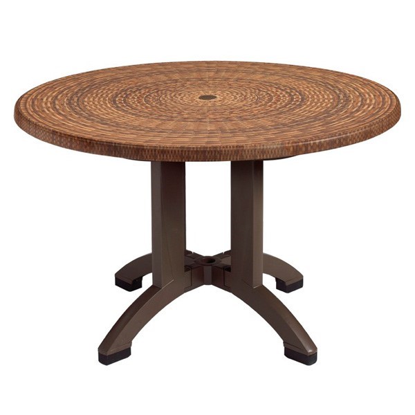 This Atlanta round 42" table is made of 100% prime resin materials resistant to salt water, chlorine and most stains. Fashioned with a wicker pattern that will accent most decors. The large 4-prong pedestal base offers. Features an umbrella hole with cap to fit any umbrella with a 1 1/2" hole. Easy to assemble and maintain. Our outdoor furniture is designed for the restaurant and hospitality industries, call today to find out about quantity discounts.