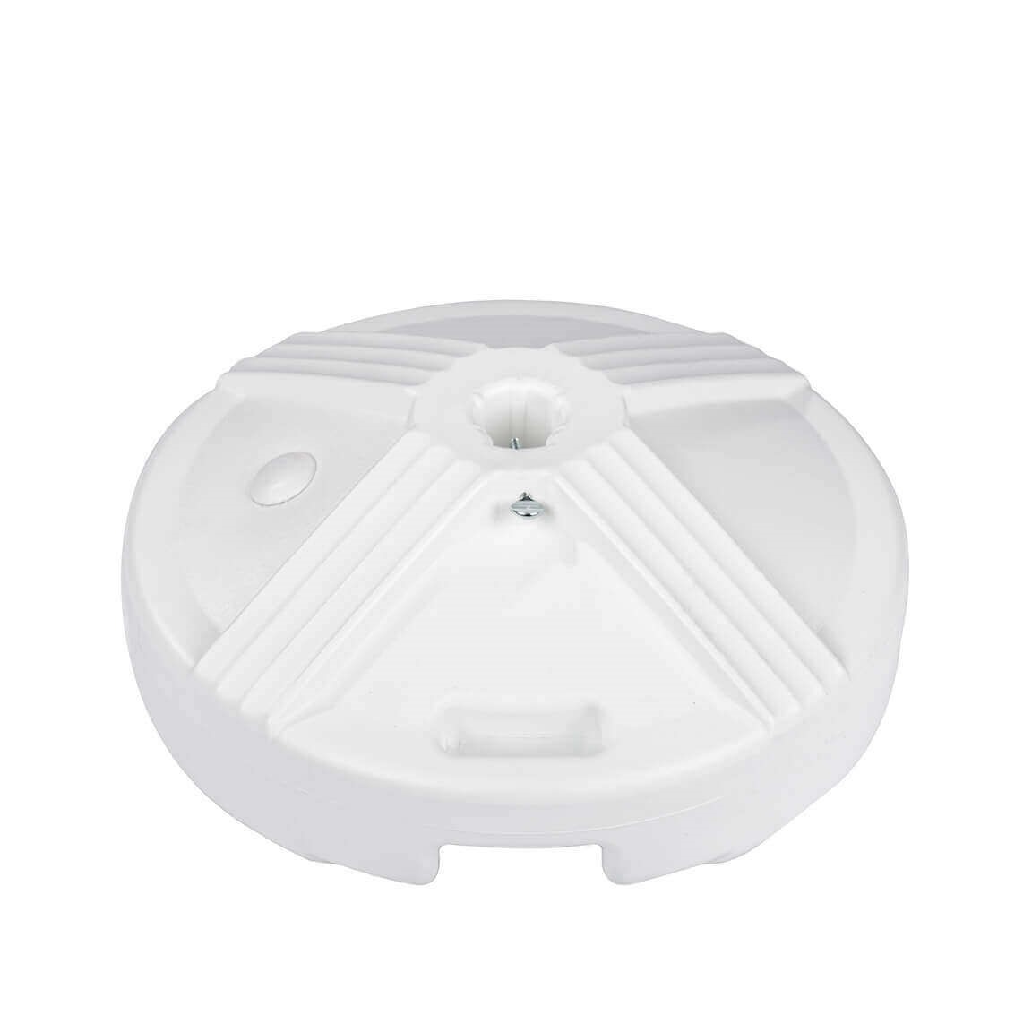 This 16" plastic round resin coated 50 pound concrete filled umbrella base is designed for under table use. Accommodates umbrellas with 1.5" thick poles and the base is 6" high. Umbrella damage can be caused by umbrellas not being secure in an umbrella base. To ensure this doesn't happen, our commercial grade umbrella bases can be used in combination with the Ubrace to ensure your umbrella doesn't fly away! Does not support a free-standing umbrella.