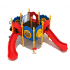 Admirals Cove is a one-of-a-kind play system suitable for all ages, but especially ideal for preschoolers. It features three different types of slides and four unique activity panels, providing a variety of options for kids to enjoy. The Straight Slide offers the quickest ride without any bumps or turns, while the Wave Slide adds a little extra bounce with its shape and the Turn Slide provides some angular momentum. The activity panels are designed to cater to a range of interests - two are musical and two are for games. The Chime Panel and Percussion Panel both produce various notes, allowing children to create their own tunes. Additionally, there are two sets of drums and a Rain Wheel located at the base of the structure for added accompaniment. The game panels include a Ball Maze Panel, perfect for solitary play, and a Plinko Panel, great for playing with friends. This play system meets National Standards for ASTM F1487-17 and CPSC Guidelines #325. It is suitable for children aged 2-12 years and has a capacity of 34-40 children. The fall height is 48 inches, the post diameter is 4.5 inches, and the required safety zone measures 33 feet 6 inches by 32 feet 10 inches. It also provides ADA accessibility for six elevated components and four ground-level components.