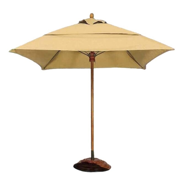This 7.5 ft. Augusta square fiberglass market umbrella with one-piece aluminum pole and marine grade fabric will provide a lot of comfort to your hot patrons. The canopy is supported by solid .75" diameter fiberglass ribs molded with nylon joints and end tips that are both incredibly strong and flexible. Fiberglass ribs are designed to absorb strong winds without breaking or permanently damaging the umbrella, making it more practical than steel or wood. Made from long lasting marine grade fabric by Outdura or Sunbrella, the canopy is designed to resist the bleaching effects from the sun's UV rays. A wind vent opening has been added to the canopy top that allows the wind to escape, keeping the umbrella from flying away. The decorative 1.75" diameter aluminum pole is designed to simulate a beautiful wood finish, that is much lighter than wood and won't rot, crack, or rust. Comes with a push-up and pin feature. All stainless steel hardware included.