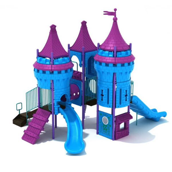 Convert your playground area into a vibrant community gathering space with the Cold Harbour Commons play structure, part of the unique Castle Series! Featuring a variety of elevated and ground level activities, children can exercise their imaginations in countless ways. The DrawBridge Climber and Pod Climber provide exciting ways for kids to access the structure, while the Double and Right Turn Slides offer safe and thrilling ways to descend. Musical play is made easy with the Bongos and Single Drum, located near the Bubble Panel and castle entrance. The Cold Harbour Commons also boasts a wide array of panels, including the Store Panel, Pinball Activity Panel, and Hare & Tortoise Panel, to keep little ones engaged and entertained. With the play structure's interactive design, it's never been simpler to provide a space for children to learn and play. This structure meets national safety standards and can accommodate 36-40 children ages 2-12. It has a fall height of 60" and features sturdy 3.5-inch post diameters. The safety zone measures 28' 1" x 34' 0", and the structure is ADA accessible with 8 components at elevated level or 4 components at ground level.