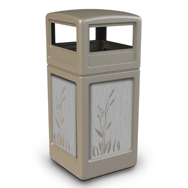 Add to your location with this 42-gallon dome stainless steel cattails paneled receptacle whether a park, zoo, museum or restaurant. Features a polyethylene plastic body and lid which has higher resistance to rust, dents or chips with convenient 12.25 x 6" openings on each side. On each side of the body is the unique stainless steel contemporary cattails panels which add visual flair no matter where it's placed. Inside is the secure Grab Bag trash bag system which makes maintenance hassle-free. Multiple color options available for you to choose a look that's right for your location! 1-year commercial warranty included. Made in the USA.