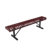 The sleek and durable ELITE 6 Ft. Thermoplastic Polyethylene Coated Strapped Steel Bench without Back and with Rolled Edges - an elite seating solution suitable for a variety of locations including hotels, motels, amusement parks, and city parks. Combining both comfort and style, this bench boasts rolled edges for added design flair. Its chic 11 gauge slatted steel construction is coated with thermoplastic polyethylene, ensuring protection against rust, discoloration, and damage. The sturdy 2 3/8" powder-coated steel frame adds strength and reliability to this product. Available in a range of colors for both the seat and frame, and with a choice of portable, surface mount, or inground mount frames, this bench offers versatility to suit any location. Proudly made in the USA, this product comes with a 5-year commercial warranty. Some assembly is required.