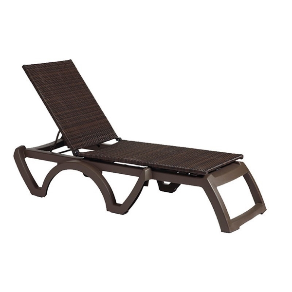 The Java all-weather plastic resin sling chaise lounge has a plastic resin frame with a sling fabric for beauty and comfort. All-weather plastic resin chaise is made with VIRO fiber - highly flexible for comfort and resistant to color fading, cracking, peeling and breaking. Chaises stack for easy storage! 4-position adjustable sling chaise lounge. Wicker sling is replaceable. Recessed wheels for ease of transportation. Hard wearing footpads for extra wear resistance. Passes ASTM F 1988-1999 Class B performance standard for commercial use.
