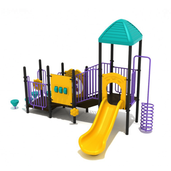 The Mission Viejo play structure is ideal for young children to learn and have fun with their friends. It features five Pebble Climbing steps located near the main entrance, providing a perfect start to a day filled with enjoyment. Additionally, the structure boasts a metal Spiral Climber on the opposite side, which allows children to reach the 3-foot pinnacle. In between these two climbing areas, there are engaging built-in activities, such as a Spelling Panel that encourages language development through the formation of three-letter words, and a Gear Panel with colorful rotating gears to stimulate fine motor skills. A Ship’s Wheel is also included on the central metal barrier, inspiring imaginative adventures. With the addition of a 3-Foot Straight Slide and a protective Square Roof, it's no wonder why Mission Viejo is a beloved play structure for every preschool-aged child who lays eyes on it. Furthermore, it meets the National Standards for ASTM F1487-17 or CPSC Guidelines #325 and is suitable for children ages 2-5. The play structure has a child capacity of 22-26 and a fall height of 36 inches. Its sturdy posts have a 3.5-inch diameter and require a safety zone of 22' 11" x 28' 7". It also features ADA accessibility, with 7 elevated components or 4 ground level components.