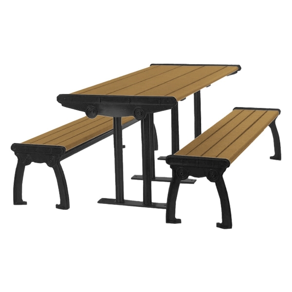 Our Park Ave recycled plastic picnic table with cast aluminum frame is perfect for gardens, parks, or residential communities. Made of heavy-duty recycled plastic slated lumber for the top and seat, this picnic table won't warp, crack, or rot, providing many years of low maintenance service. Choose a color for the slats from our cool color selection to be blended into the recycled plastic resin and the UV protectant, preventing fade and repainting. The frame consists of solid cast aluminum that is strong as it is durable. Powder-coated for a brilliant finish with your color choice to complement the tops and seats. Modular design allows the seats to be arranged for your site's specifications. Available in convenient 5 or 6-foot lengths. Portable stand-alone model with a surface mount option from casted holes on the feet. This product is made in the USA and is backed by our 5-year commercial warranty.