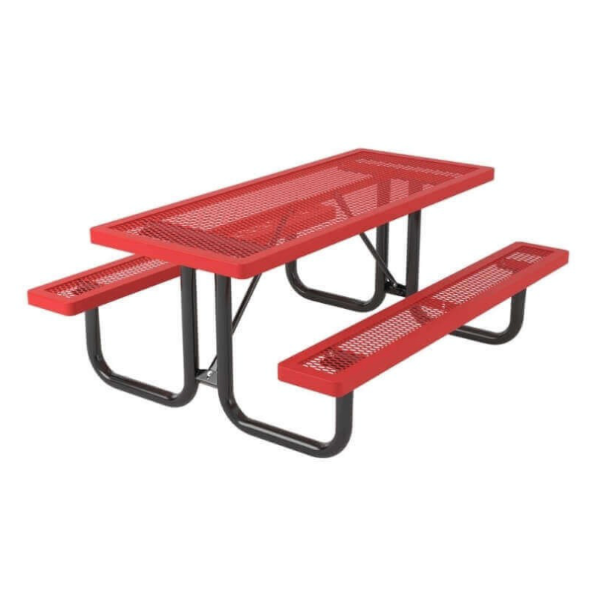 Our Regal Thermoplastic Coated Steel Picnic Table is the perfect seating solution for parks, schools, and outdoor restaurants nationwide. The elegant regal style is designed with a durable 3/4" #9 expanded metal top and a heavy-duty commercial grade powder-coated galvanized steel frame. For extra support two 2" x 2" angle iron frame bracings are used on the frame. This frame also uses a portable design and includes non-corrosive hardware. Pick between either a 6 or 8-foot length choice, and a variety of colors for the tabletop/seat and frame. The product comes with a 5-year commercial warranty and is made in the USA.
