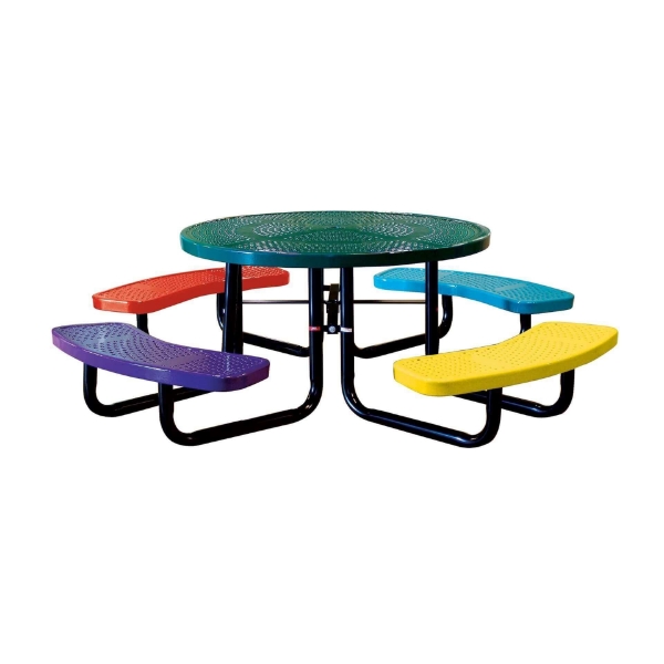 Our 46" round perforated style thermoplastic children's picnic table is ideal for schools, daycares, and playgrounds. With a seat height of 11 7/8" and an overall height of 24 1/2", children of all sizes can access the table without difficulty. Featuring the 1/2" precision punched holes with a 3" edge trimmed border, the perforated style adds weight and creates a stronger table. Our thermoplastic coating is baked onto the steel frame at a thickness of 25-30 mils adding durability and a strong resistance to vandalism. Children's picnic table have the option to have different colors for the table and seats. The frame is made with 2" tubular legs, galvanized steel hardware, and a black powder coated finish. Surface mount feet are included at no extra charge for hassle-free mounting if needed. This product is 100% American made and is supported by our 5 Year Commercial Warranty!